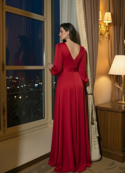 Langes rotes Kleid mit Schnitt in Taillenhöhe. Lange Ärmel mit hohem Manschettenabschluss. Überkreuzter Ausschnitt vorne. Unsichtbarer Reißverschluss am Rücken. Vollständig gefüttert.