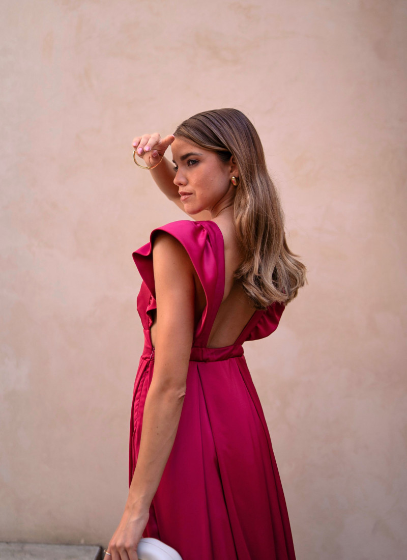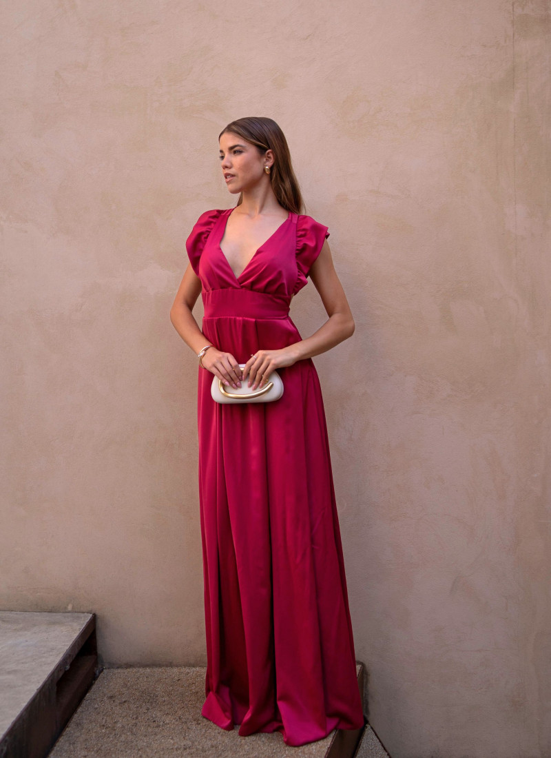 Langes rosa/kirschfarbenes Kleid mit Rüschen an den Trägern. Tiefer Ausschnitt. Vollständig gefüttert. Sie können wählen, eine gepolsterte Cup hinzuzufügen, um es zu personalisieren. Das Kleid, das Sie bei Ihrem nächsten Event tragen möchten, sei es als Hochzeitsgast, Abschlussball, Brautjungfer, unter anderem.