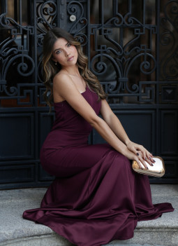 Long bordeaux dress with mermaid cut. Asymmetric neckline. Invisible side zipper. Fully lined. Cape / shawl included.