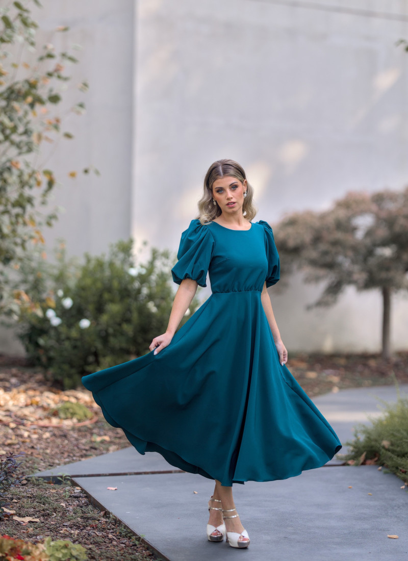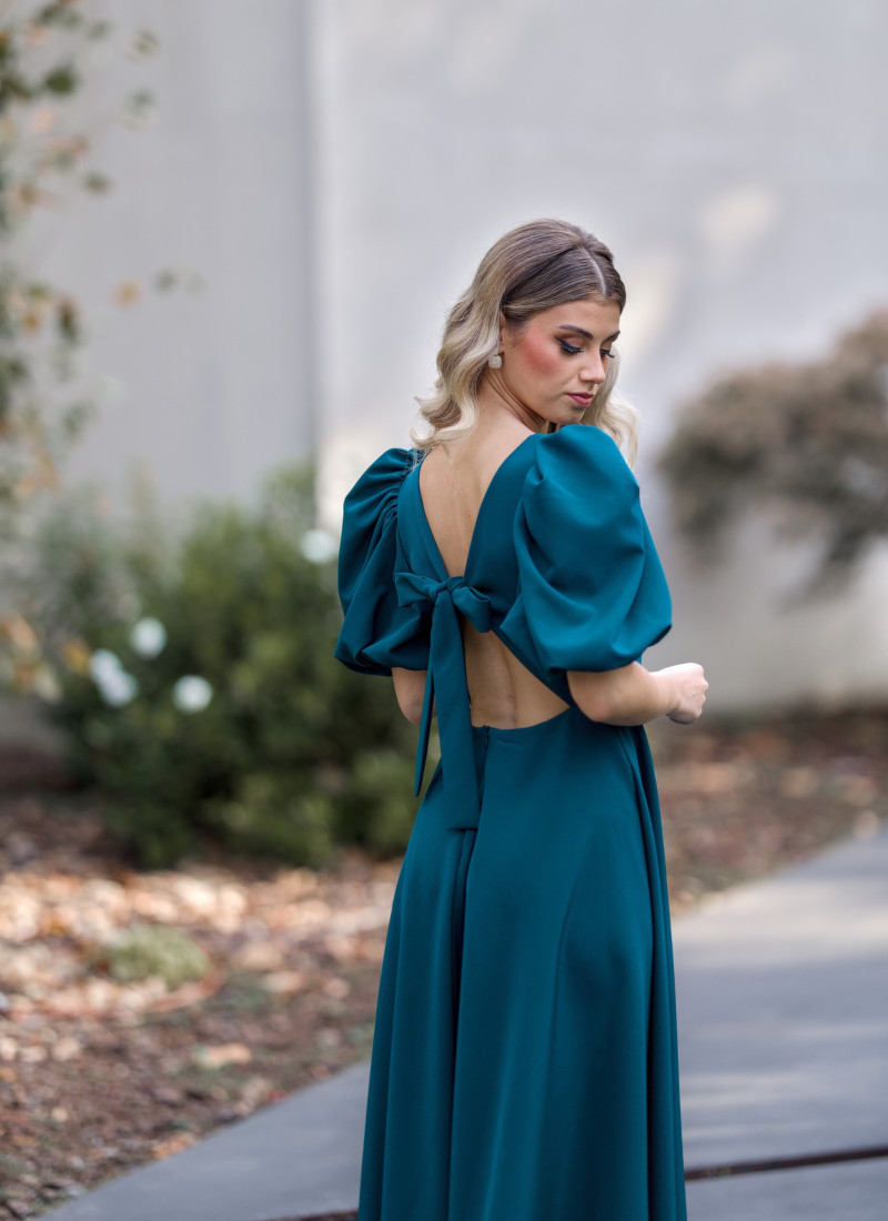 Midi dress with voluminous short sleeves. Round neckline. Back that fastens with a bow. Invisible zipper at the bottom. Fully lined dress.