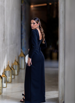 It features a circular opening at the waist and long sleeves. The dress is fully lined. Its pronounced front opening with a white flower detail makes this dress even more seductive and impossible to resist. The flower is developed and applied using manual techniques. Invisible zipper at the back.