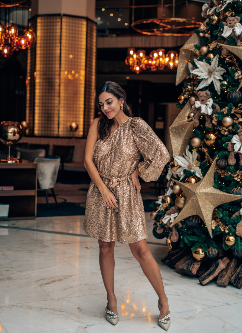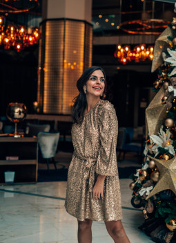 Short dress in golden sequins. Asymmetrical neckline. One long sleeve on the left side. Belt in the same fabric. Soft lining for maximum comfort. For a more relaxed style, it can be worn without the belt.