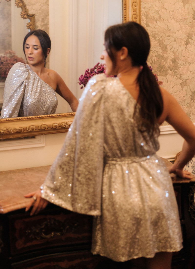 Short dress made of silver sequins. Asymmetrical neckline. Long bell sleeves. Fully lined for maximum comfort. Belt included. Limited edition.
