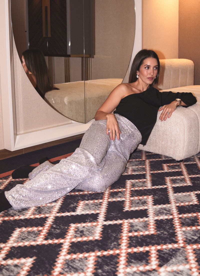 Silver sequin pants. Fully lined for maximum comfort. Invisible side zipper.