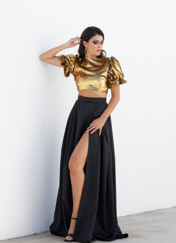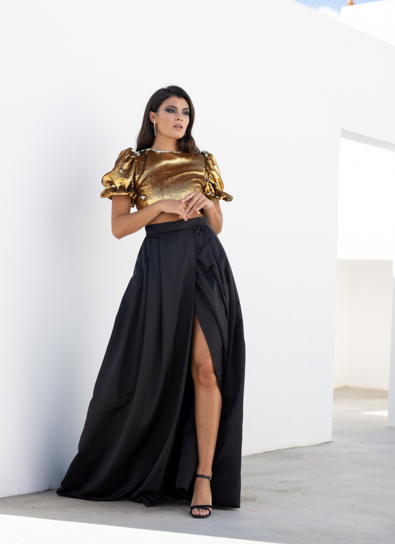 Black long skirt. It has an invisible back zipper and is fully lined. Pair this skirt with the top of the same color for a perfect look.