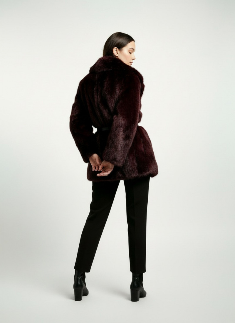 Abrigo de pelo burdeos con cuello de solapas, manga larga y bolsillos laterales. Estilo amplio / oversized.