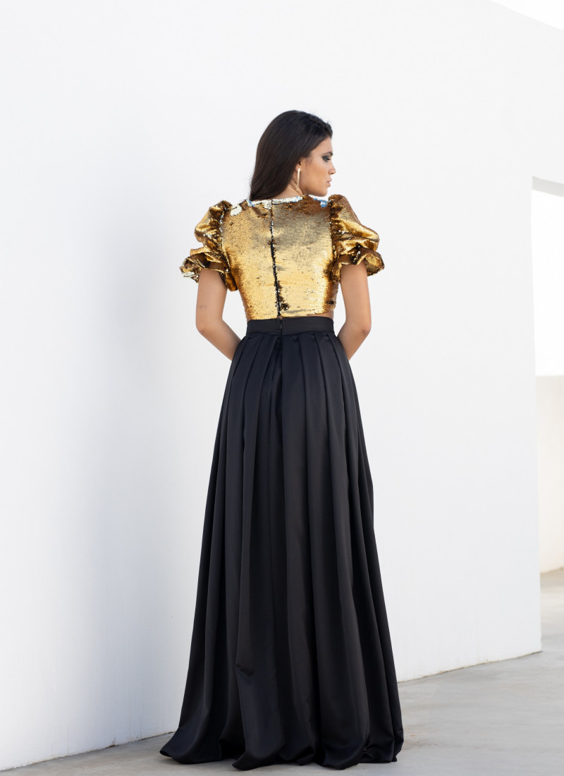Falda larga negra. Tiene cierre invisible en la espalda y está completamente forrada. Use esta falda con el top del mismo color para obtener el look perfecto.