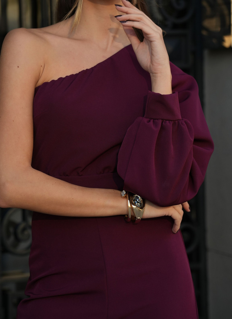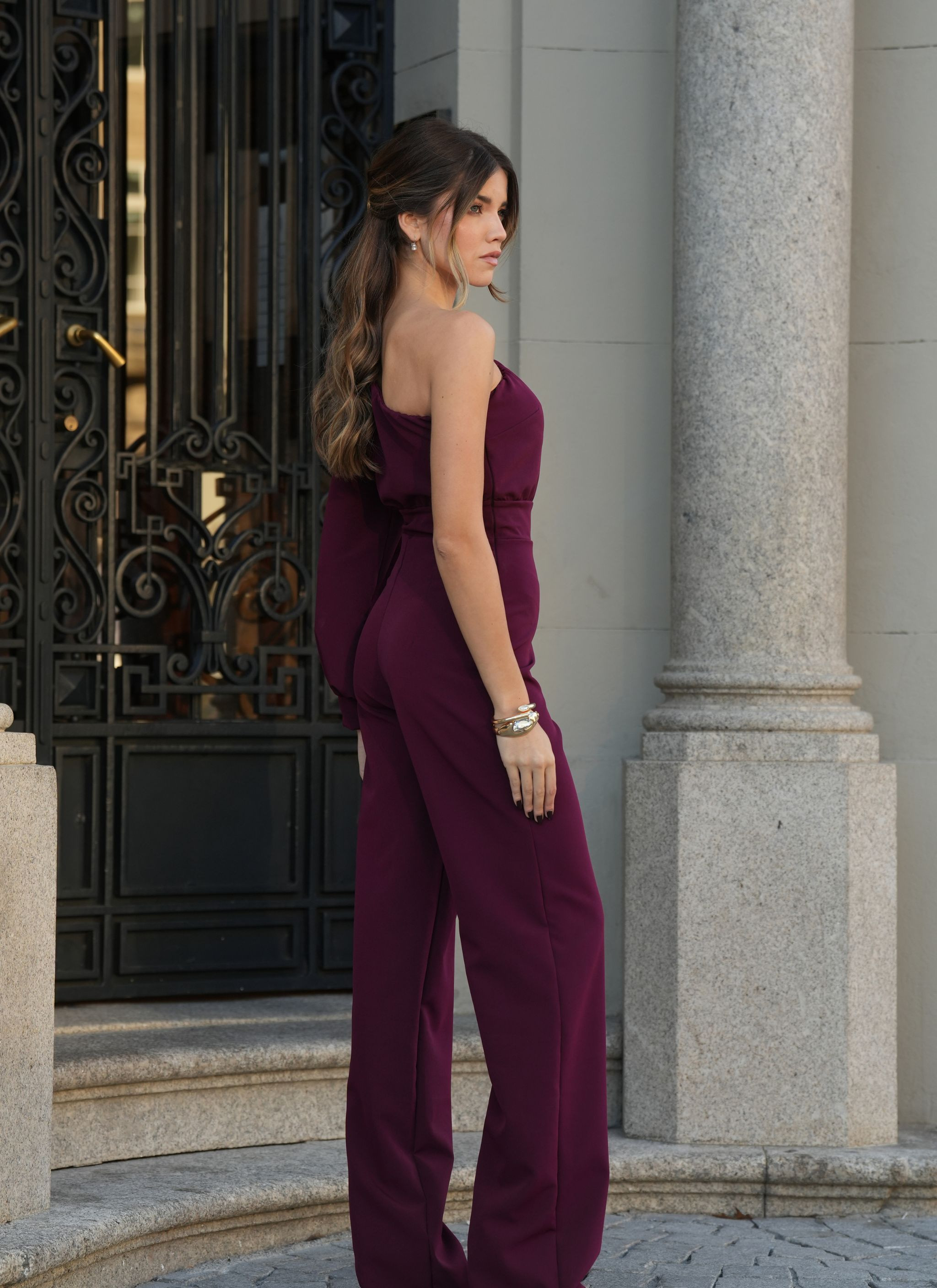 Mono burdeos con escote asimétrico y manga larga con puño. Cierre lateral. Siéntete aún más especial y elegante con este mono. Ideal para bailes de fin de curso, bodas y otros eventos formales.