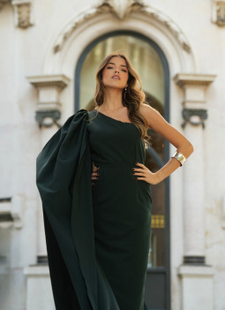 Vestido largo verde. Escote asimétrico. Manga tipo capa. Cierre invisible en el lateral. Totalmente forrado.