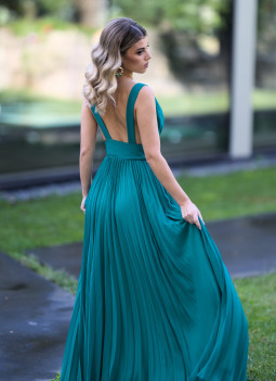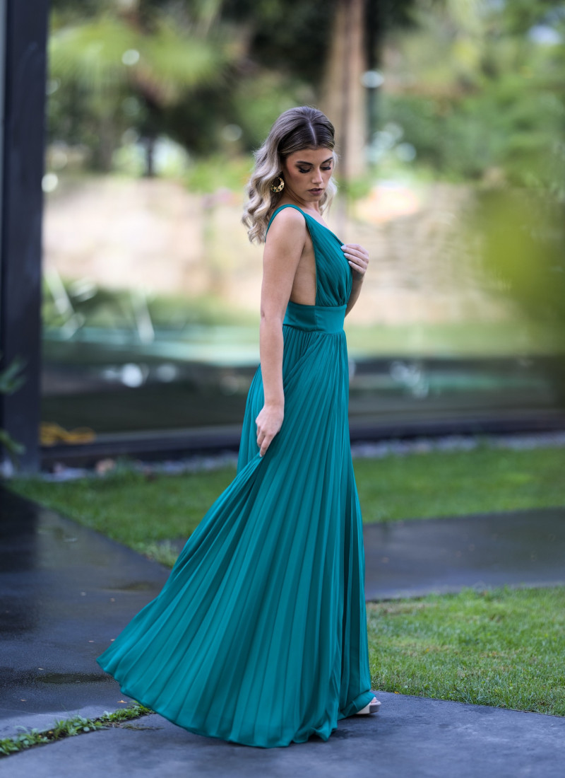 Vestido largo en tejido plisado. Escote acentuado. Silueta marcada en la zona de la cintura. Tirantes anchos. Vestido totalmente forrado. Cierre invisible en el lateral del vestido. Puede elegir personalizar añadiendo copa acolchada.