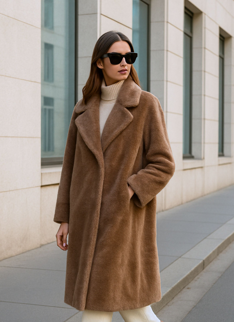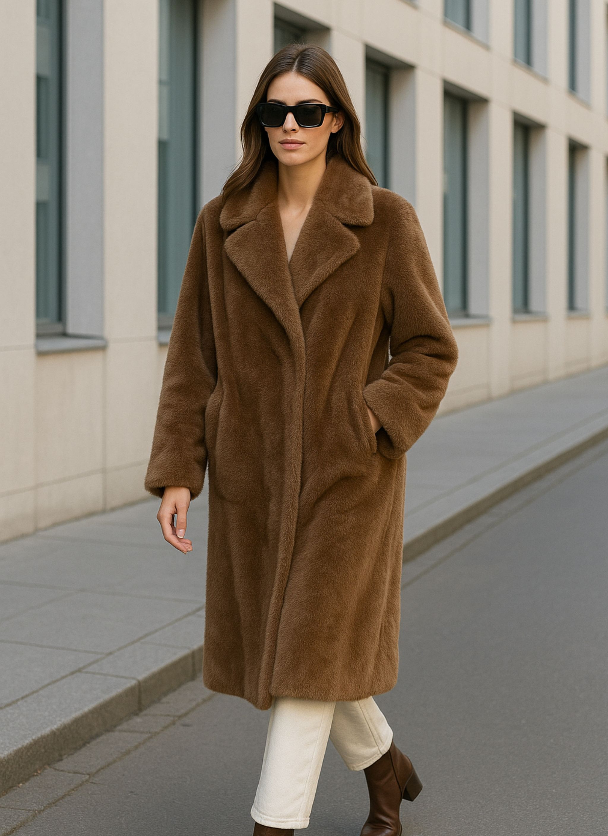 Manteau en fausse fourrure avec manches longues et poches latérales. Style ample. Tissu chaud, résistant, doux et très confortable.