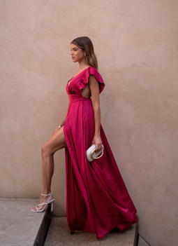Robe longue rose/cerise avec volants sur les bretelles. Profond décolleté. Entièrement doublé. Vous pouvez choisir de personnaliser en ajoutant une coque rembourrée. La robe que vous voudrez porter lors de votre prochain événement, que ce soit en tant qu'invitée à un mariage, bal de fin d'année, demoiselle d'honneur, entre autres.