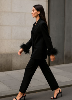 Blazer oversize in tessuto strutturato nero. Dettaglio di piume al termine della manica. Presenta colletto e revers. Chiusura frontale incrociata con bottoni rivestiti nello stesso tessuto. Lo abbini ai pantaloni dello stesso colore e tessuto.