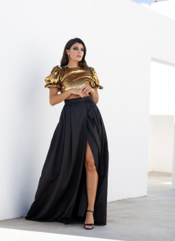 Gonna lunga nera. Ha una chiusura invisibile sul retro ed è completamente foderata. Indossi questa gonna con il top dello stesso colore per un look perfetto.