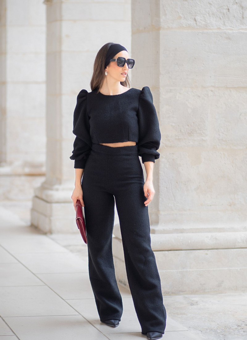 Top con scollo rotondo e maniche lunghe con polsini. Chiusura invisibile sul retro. Completamente foderato. Prodotto in tessuto tweed premium italiano. Edizione limitata.