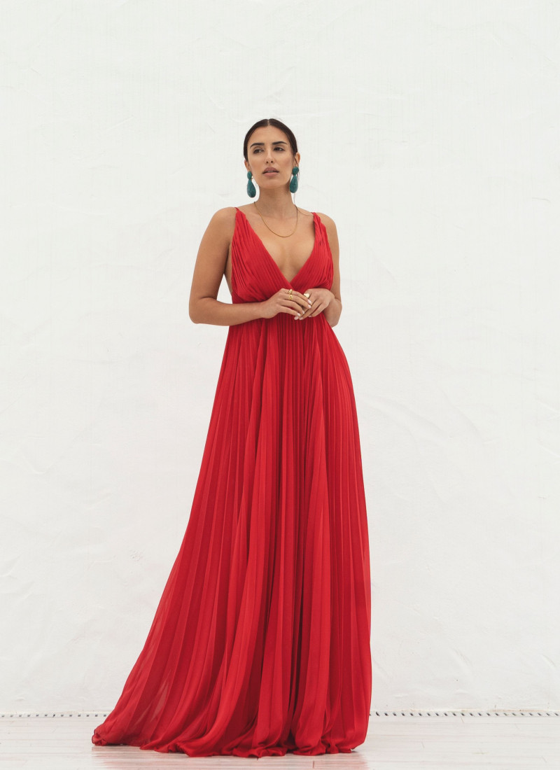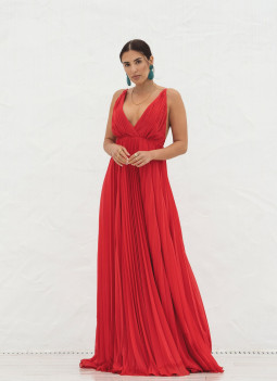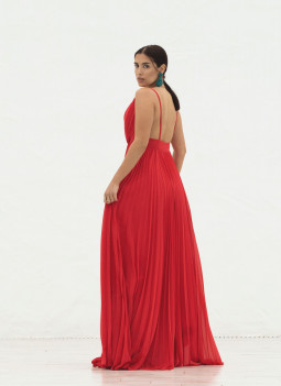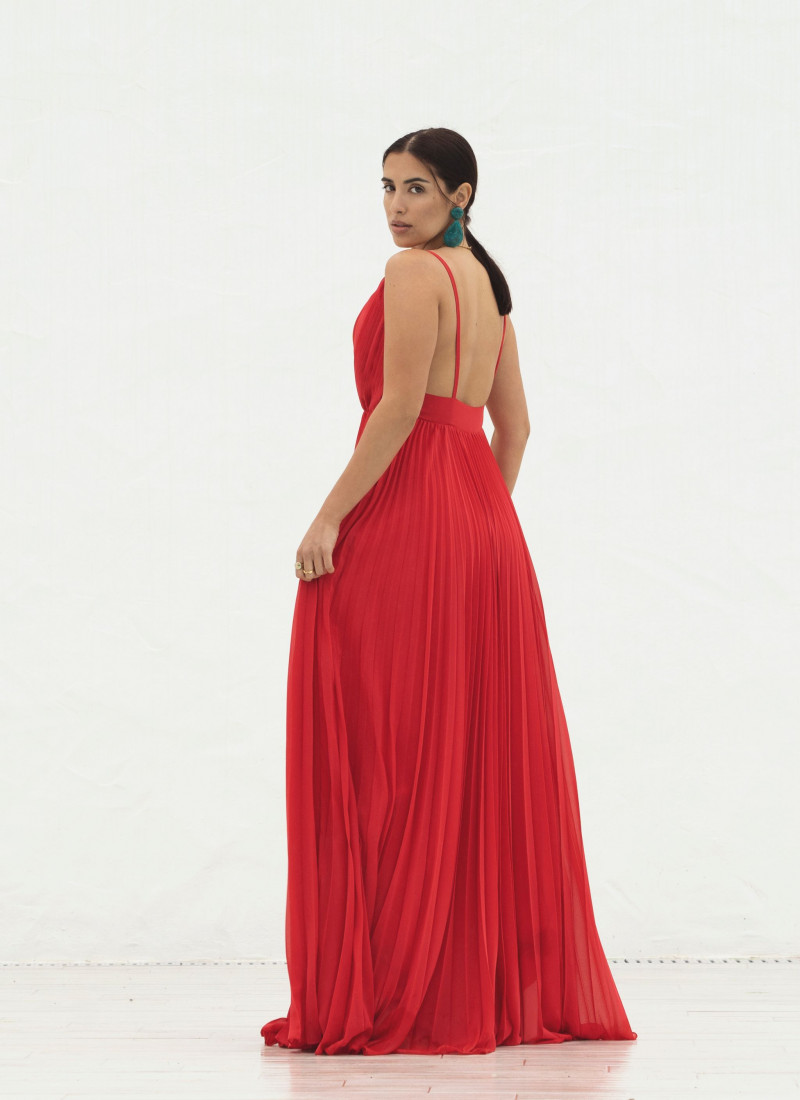 Vestito plissé rosso. Spalline sottili e scollo profondo. Completamente foderato. Chiusura invisibile sul lato dell’abito.