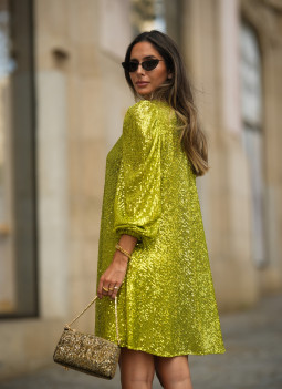 Vestito corto in paillettes. Maniche lunghe. Brilla ancora di più alla tua prossima festa!