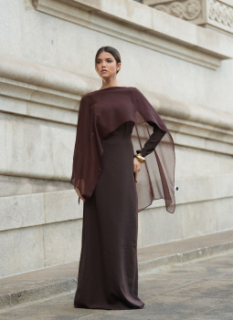 Vestito lungo marrone. Scollo a barca. Maniche lunghe. Schiena con dettaglio di scollo profondo. Chiusura invisibile laterale. Completamente foderato. Scialle incluso.
