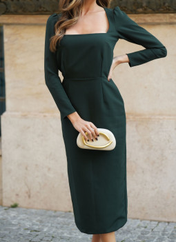 Vestito midi verde. Scollo quadrato. Maniche lunghe. Chiusura invisibile laterale. Completamente foderato.
