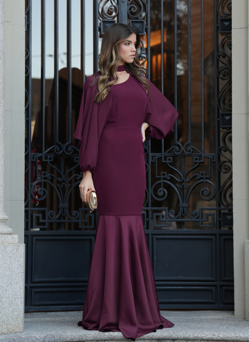 Vestito lungo bordeaux con taglio a sirena. Scollo asimmetrico. Chiusura invisibile laterale. Completamente foderato. Mantella / scialle inclusa.
