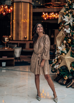 Vestito corto in paillettes dorate. Scollo asimmetrico. Una manica lunga sul lato sinistro. Cintura nello stesso tessuto. Fodera morbida per il massimo comfort. Per uno stile più casual, può essere indossato senza cintura.