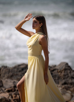 Vestito lungo giallo chiaro. Scollo asimmetrico con effetto drappeggiato. Apertura frontale nella gonna. Chiusura invisibile laterale. Completamente foderato. Elegante e sofisticato per matrimoni, balli di fine anno, damigelle d'onore e altri eventi.