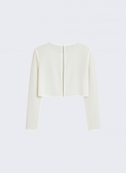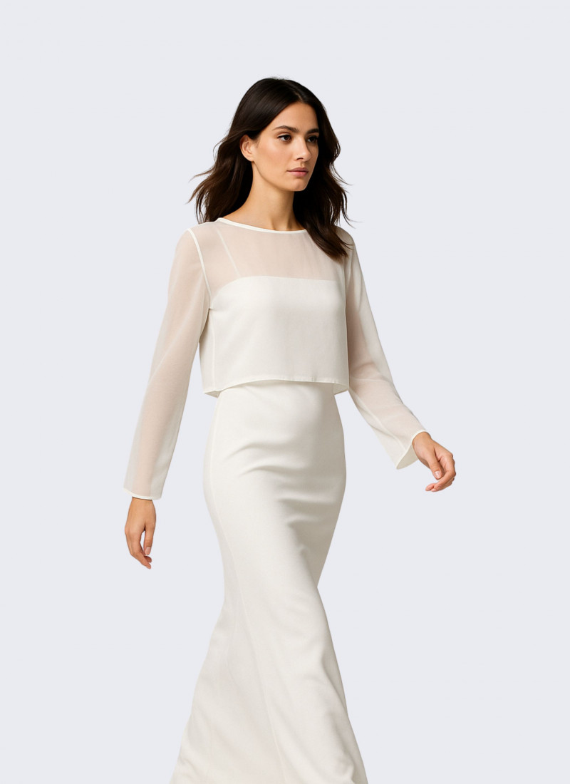 Capa com manga comprida e decote redondo. Aperta com botão atrás do pescoço. Tecido chiffon translúcido, sedoso e suave. Disponível em mais cores.