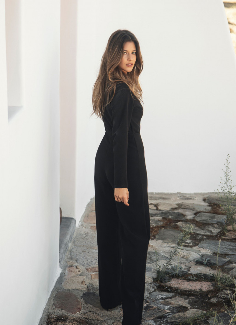 Macacão preto com decote acentuado e manga comprida. Fecho invisível na lateral. Sinta-se ainda mais especial e elegante com este macacão. Ideal para bailes de finalistas, casamentos e outros eventos formais.
