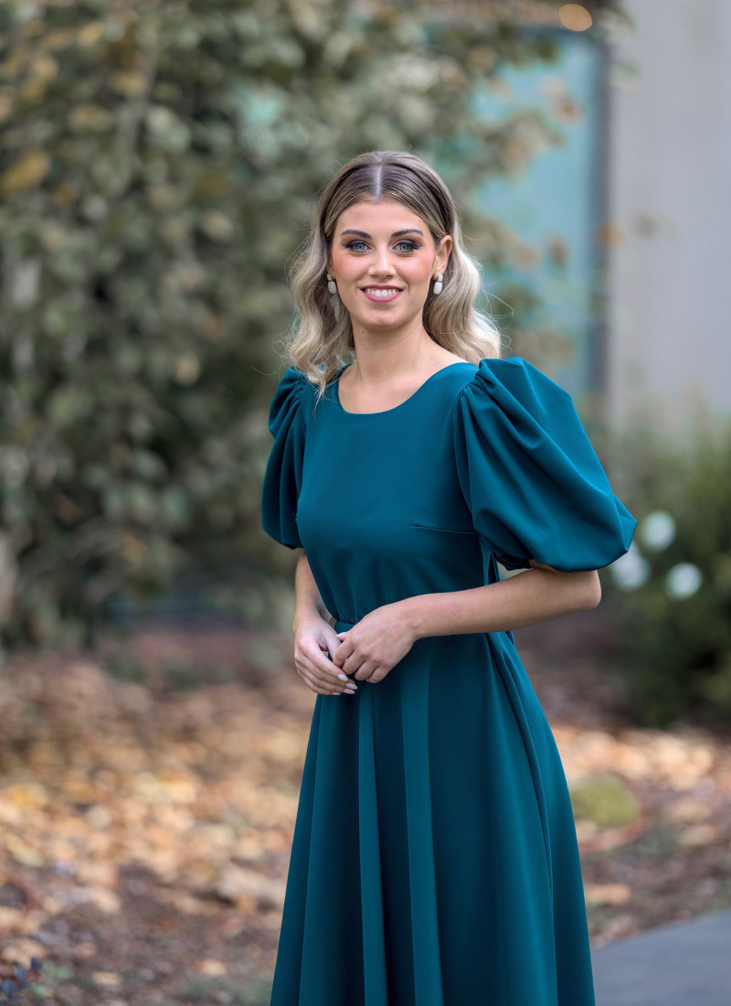 Vestido midi com manga curta volumosa. Decote redondo. Costas que apertam com laço. Na parte inferior possui fecho invisível. Vestido totalmente forrado.