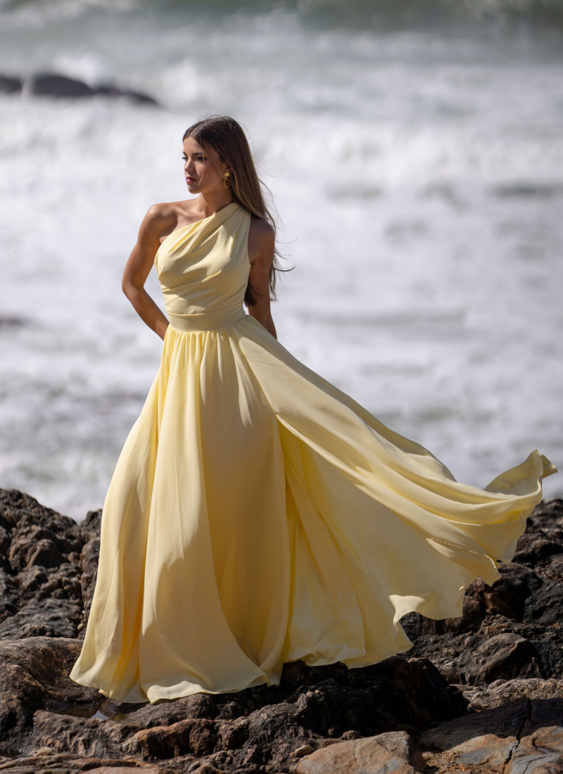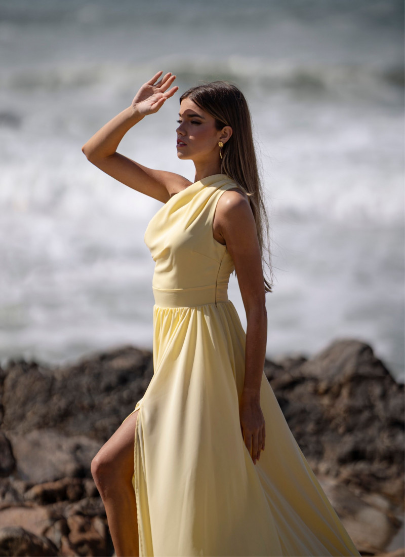 Vestido longo amarelo claro. Decote assimétrico com efeito drapeado. Abertura frontal na saia. Fecho invisível na lateral do vestido. Totalmente forrado. Elegante e sofisticado para casamentos, bailes de finalistas, damas de honor, e outros eventos.